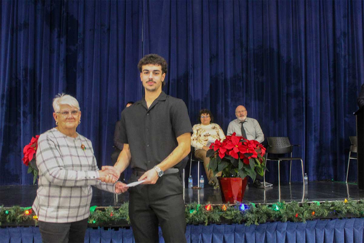 To two deserving graduates continuing post-secondary. Presented by Legion 1st Vice President Duane Deschamps and Legion Secretary Christy Deschamps to Landon Aelick and Cole Hughson.