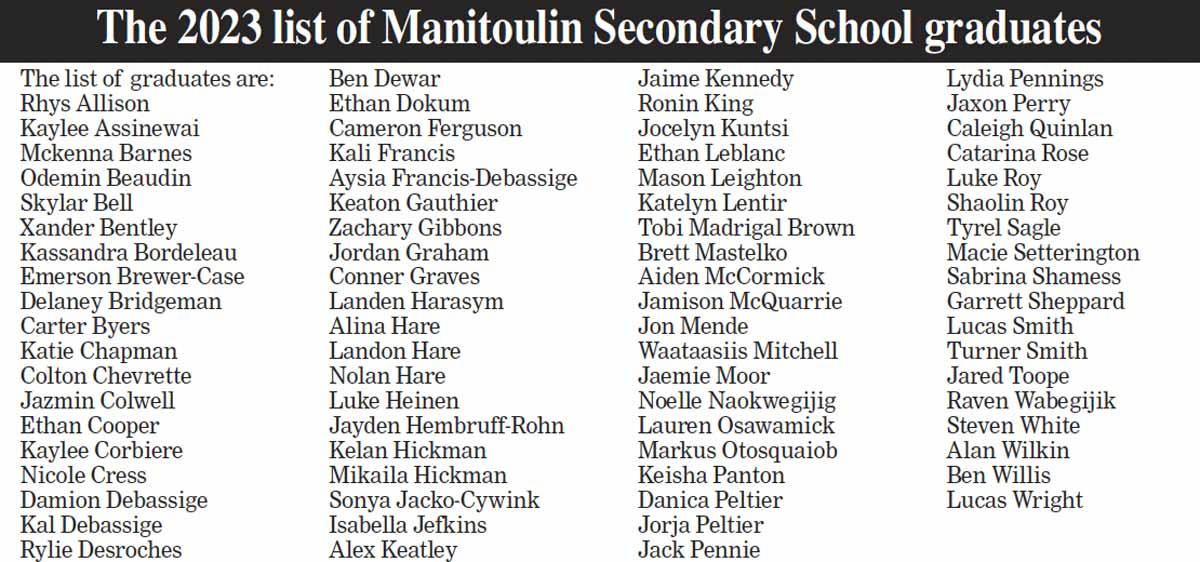 M’CHIGEENG—The atmosphere was electric at Manitoulin Secondary School as students, families and faculty members came together to celebrate the remarkable achievements of the graduating class of 2023. The Manitoulin Secondary School graduation ceremony marked a significant milestone in the lives of these students, who are now ready to take on the new challenges the next chapter in their life will bring them.
