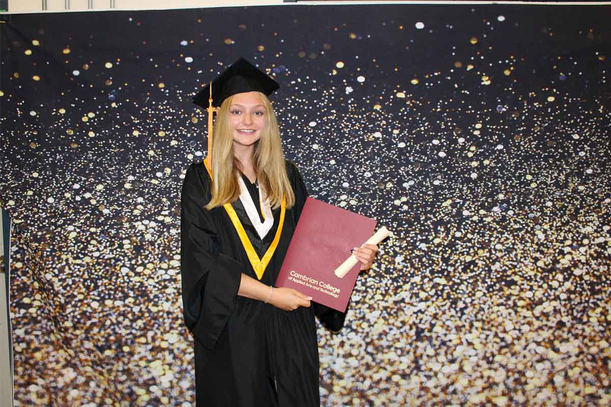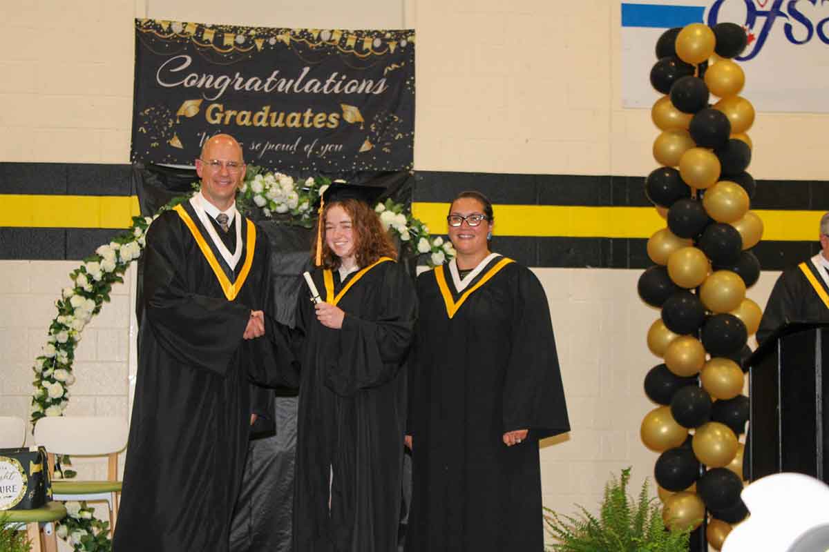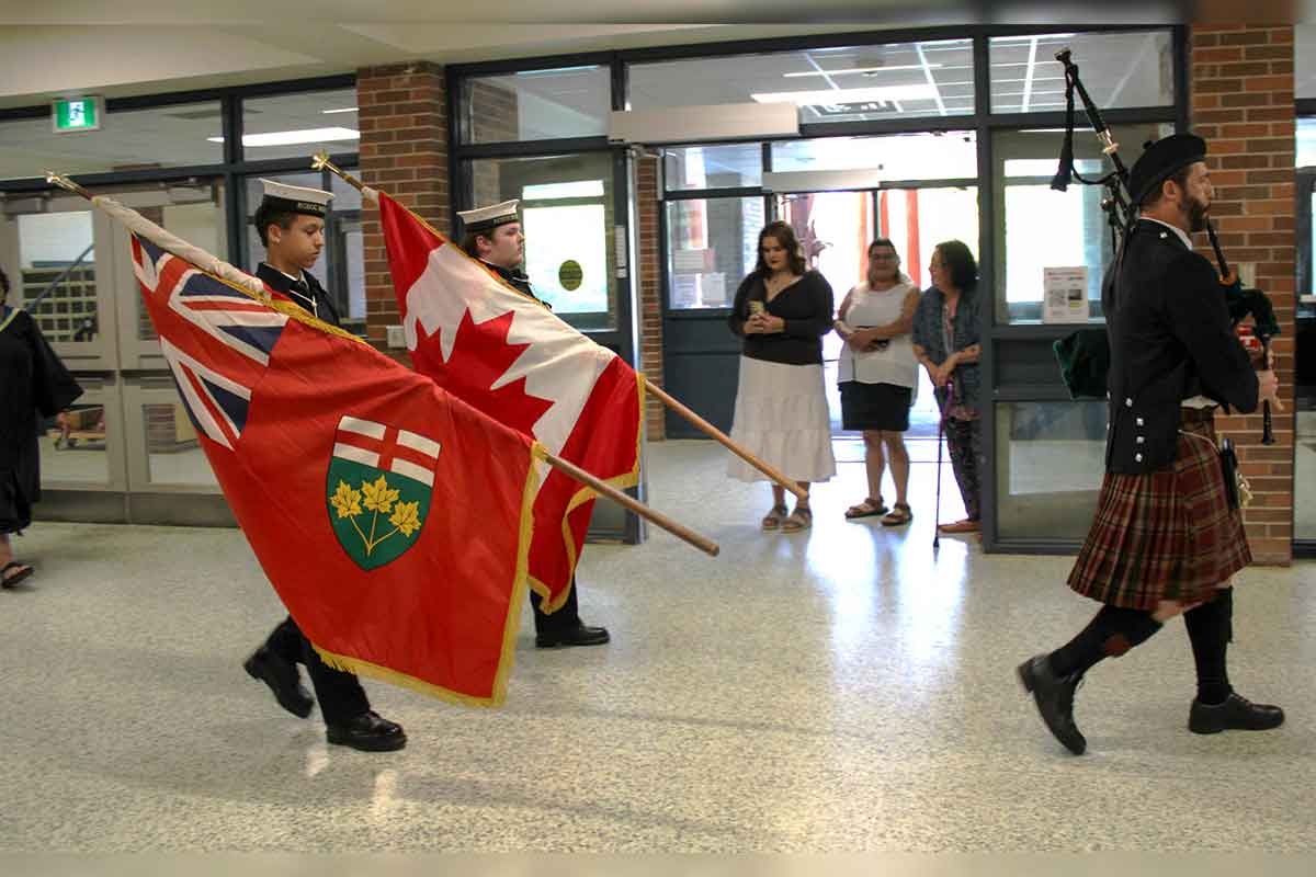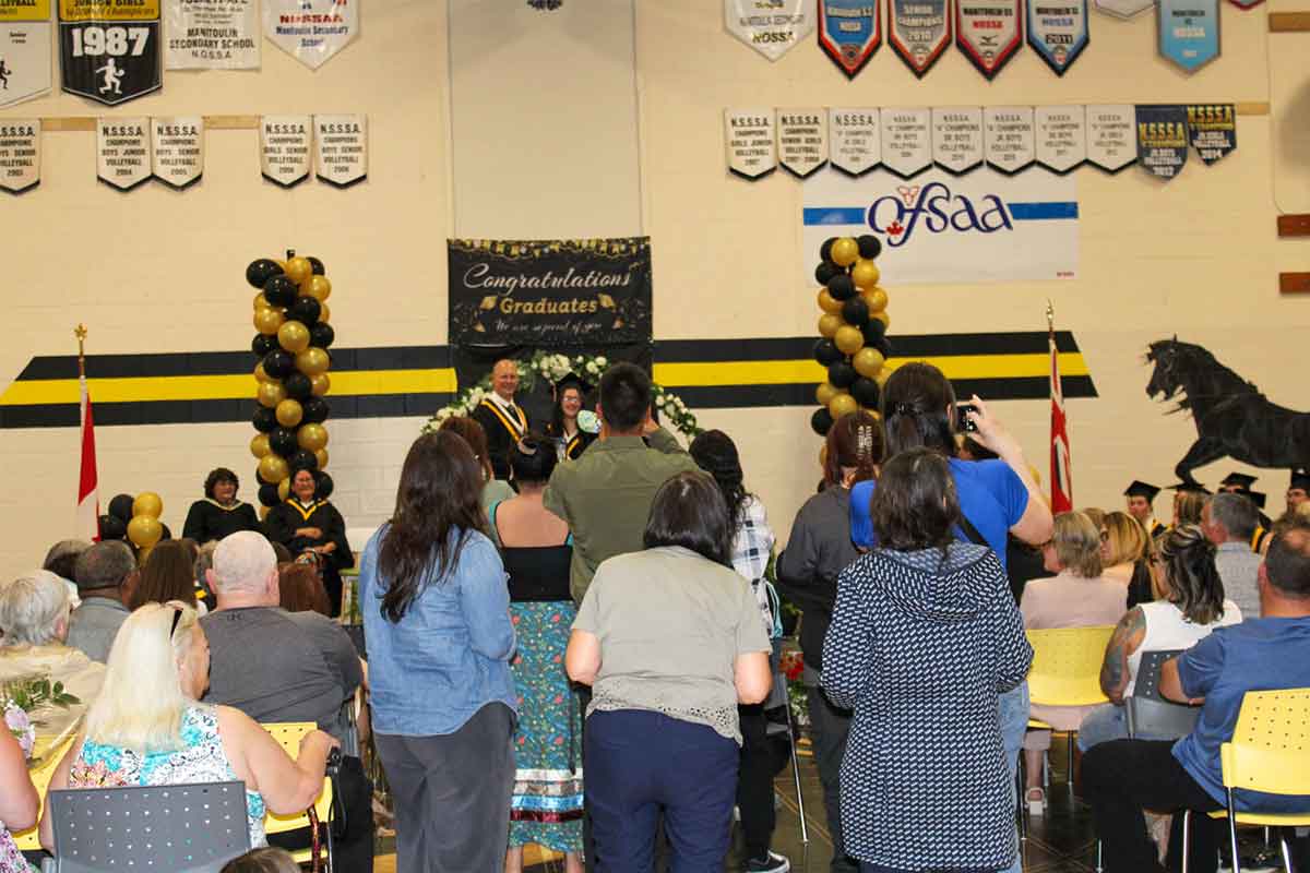 Before receiving their diplomas, Mike Zegil had some instructional words for the students. “You will be crossing this stage to receive an Ontario Secondary School diploma,” he said. “Graduates, please remember as you walk across this stage, to take a moment to look at the crowd and the community that is here to support you—your friends, your family, your loved ones. Take a moment to reflect and more importantly, take a moment to pause to allow your family to take as many pictures of you as possible. Enjoy your moment and be sure to smile for the camera.” And the presentation of diplomas began.