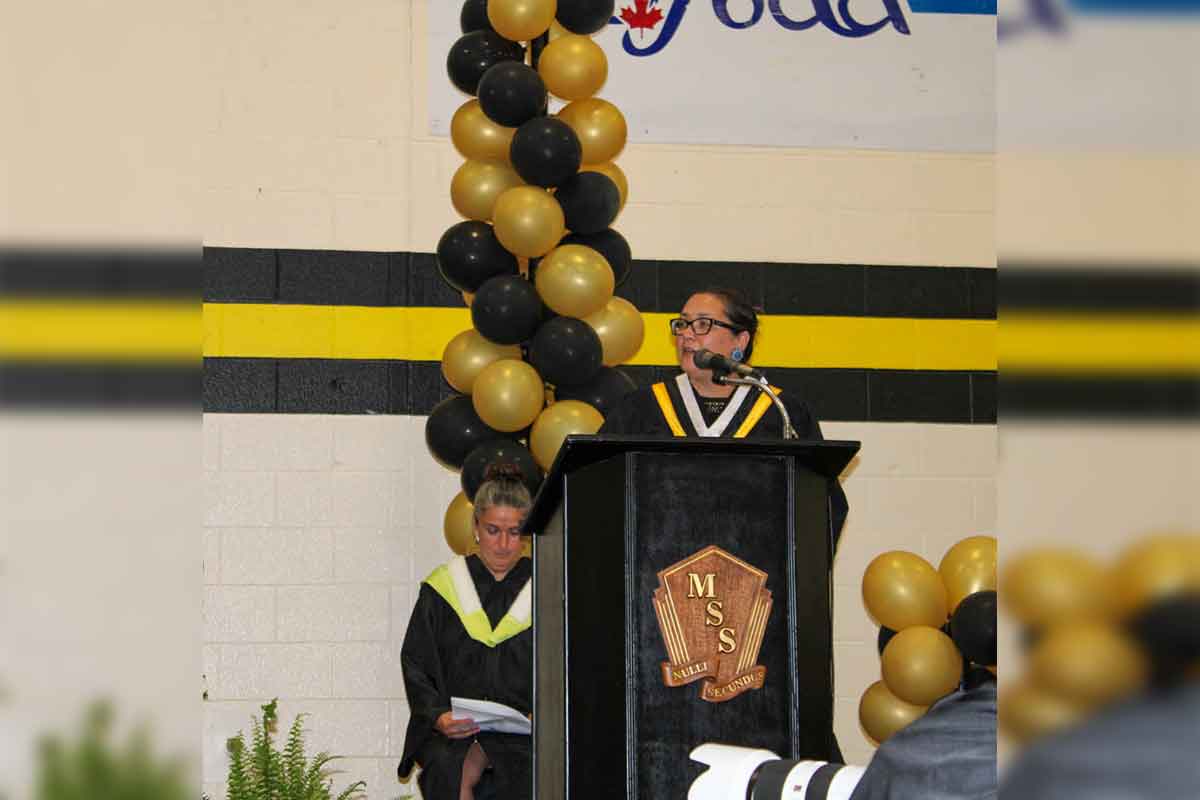 Trustee Lisa Corbiere Addison expressed her honour in bringing greetings from the Rainbow District School Board. “We Islanders are a special group of people. We come together tonight to surround these young graduates with love and respect. Whether you’re born here, or migrated here, we become one family, an Island family. Going to school here at MSS is so unique. Growing up in your smaller communities, initially competing against one another in elementary school events. Four years ago, you became part of MSS, a larger family, now on the same team.” Ms. Corbiere Addison advised the students, “Keep an open mind about things, it will help you grow as people and continue to care as you make your way in life. It helps make the world a better place.” In conclusion, she said, “When you make your mark in the world, don’t forget to give back, our future generations are counting on it. Thank you. Miigwetch.”