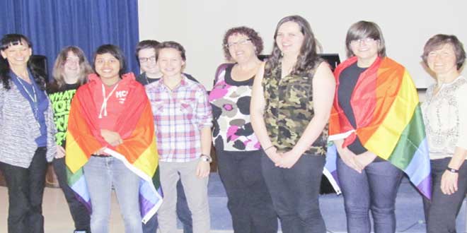 The students, parents and community members were welcomed to the MSS Equity and Inclusiveness Feast by Valerie Beaudin, School Council chairperson. “An evening like this opens the door for great conversations with our teenagers,” Ms. Beaudin said, adding that students may be questioning their sexual orientation and/or their gender identity or may be simply curious about lesbian, gay, bisexual, transgender/two-spirited (LGBT/two-spirited) issues and they may be uncomfortable talking about these topics. “Developing an environment that is inclusive and diverse is reflective of how a student sees themselves as part of this larger world rather instead of seemingly left out of it.” As the guest speakers delivered their talks, those in attendance feasted on foodstuffs prepared by Tammy Albers, a School Council member. “I miss one meeting,” said Ms Albers, “Just one meeting and they decide to put me in charge of the feast!” Ms. Albers certainly had a lot to work with as foods were donated by Island companies as well as parents and cooking classes and Ms. Albers herself made and decorated an amazing cake.