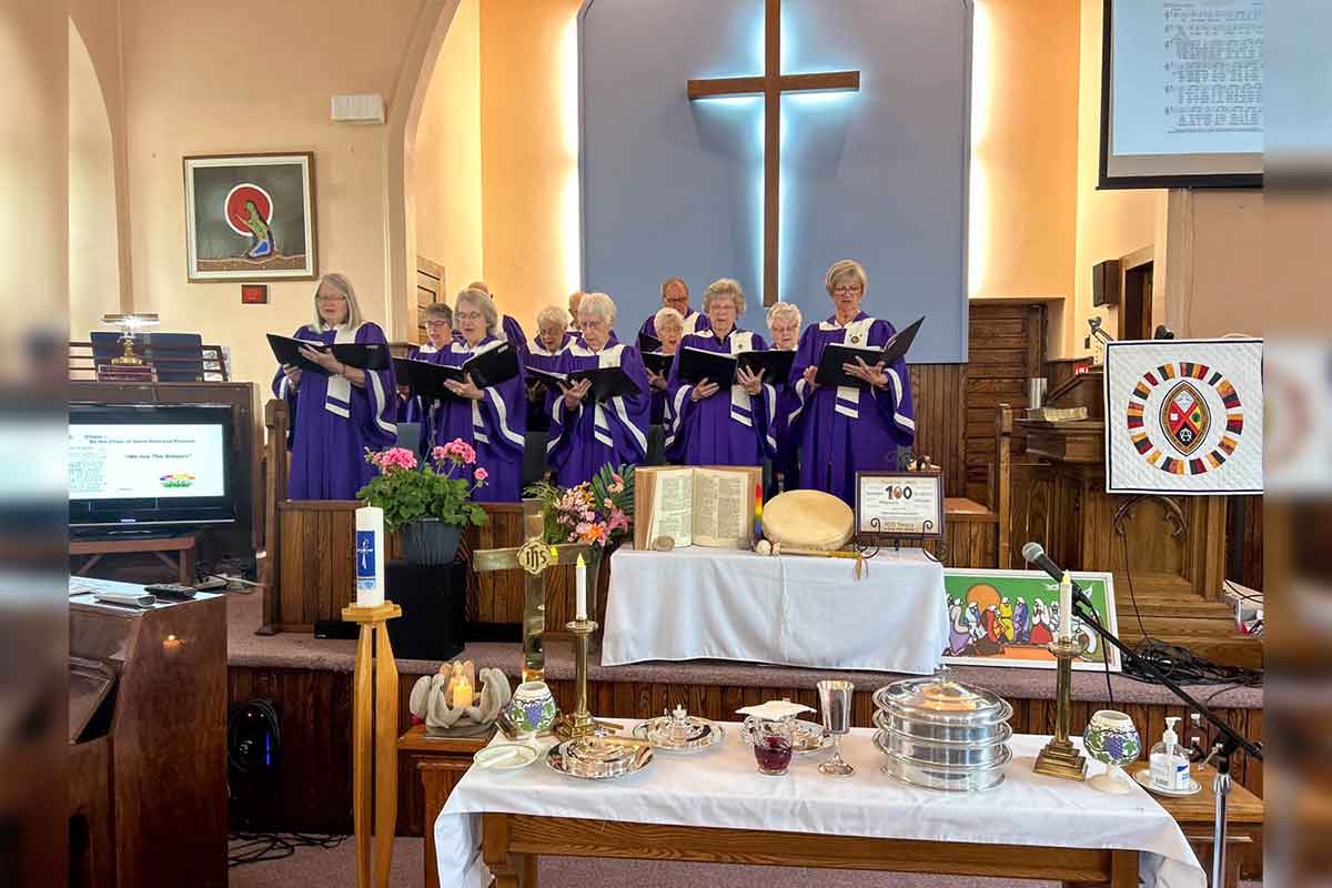 Members of the choir, some of whom came from afar for the anniversary service as choir alumni/ae, were dressed in their purple robes and aided the service with their ministry of song. Hymns from the denominations that formed the church union 100 years ago—Presbyterian, Methodist and Congregationalist—were sung throughout the service. The church was full for the occasion and communion was served in the Presbyterian style, according to Rev. Whitney Bruno.