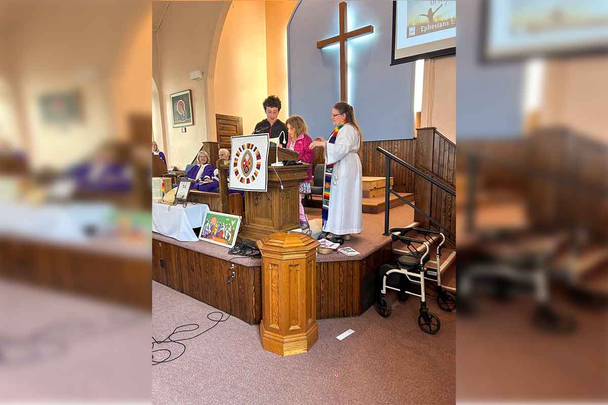 Former Little Current United Church minister Rev. Faye Stevens recalled the liturgical art project led by fibre artist Judy Martin, who was present for the service. Over four years, and under Ms. Martin’s direction, four different tapestries were made out of recycled material and hand-stitched by community members. Every Thursday from October 29, 2009 to September 2013, people gathered to work for a few minutes or a few hours. One-hundred and thirty-eight people worked on the project ranging in age from seven to late 80s.