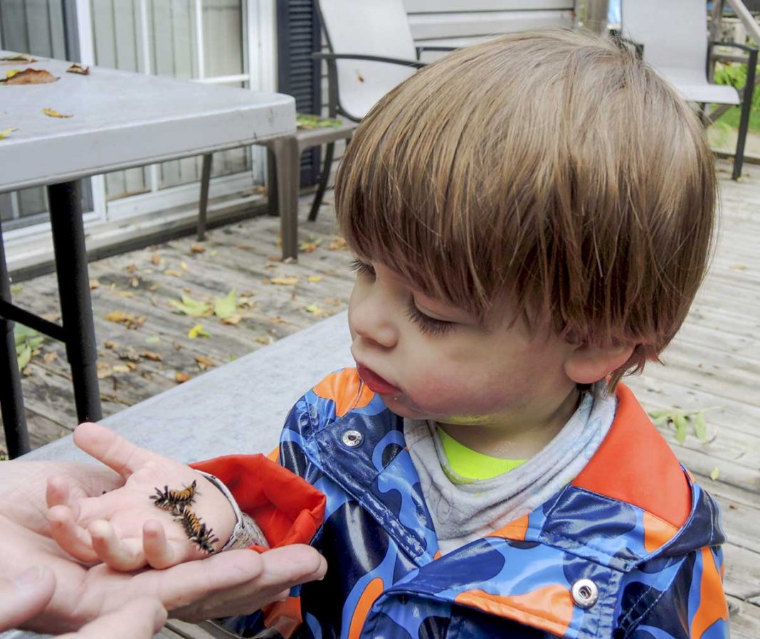 After a few moults, they turn into beautifully-coloured caterpillars that look like fuzzy bedroom slippers or fluffy calico-coloured shih tzu puppies. Later, the black, white and orange tufted larvae feed individually, or in pairs, and wander off their defoliated hosts in search of new milkweed plants.