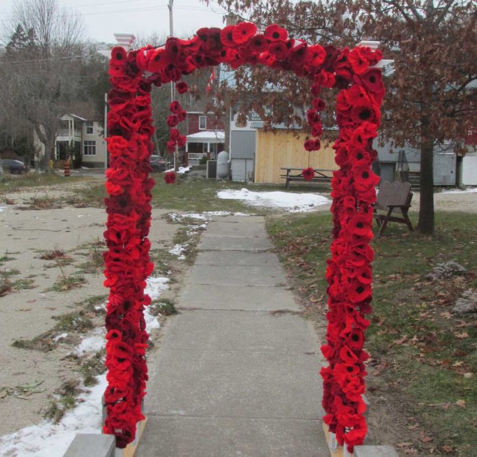“Also this morning, we have a very special addition to our service,” said Mr. Woods. “To the left of the cenotaph is the Poppy Arch. This arch was created by the women of our community and the surrounding area. Approximately 1,200 poppies were knitted by them and then hand-tied to create this lovely piece. We are very grateful for their contribution to our service.”