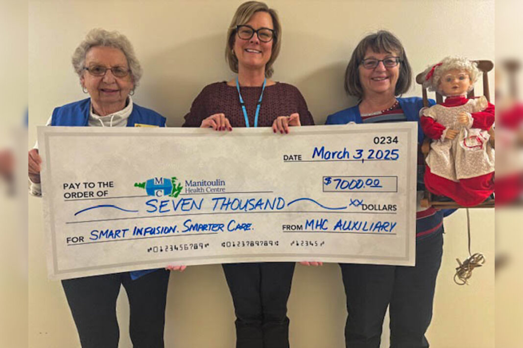 MHC Little Current auxiliary members June McConnell and Carol Labelle (along with their mascot Mabel) recently presented MHC president and chief executive officer Paula Fields with a cheque for $7,000 to support the hospitals fundraising campaign ‘Smart Infusion, Smarter Care,’ raising funds towards the purchase of new IV pumps for both its Island hospital locations.