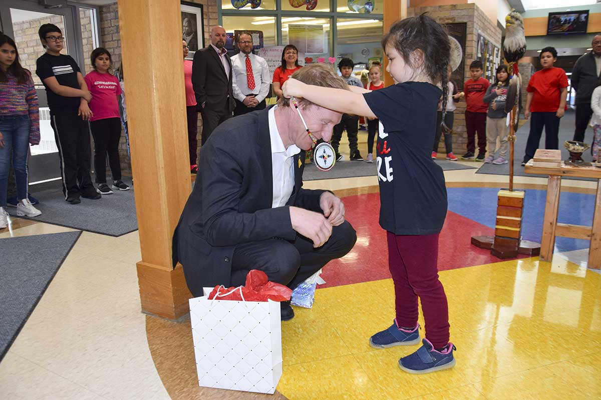 Following the greetings at the band administration offices, the minister toured the community’s new daycare and Shawanosowe School. The minister was greeted by students from the school. Student Olivia Pelletier presented the minister with a gift of a beaded medallion, which she hung about his neck while staff and students sang a water song.