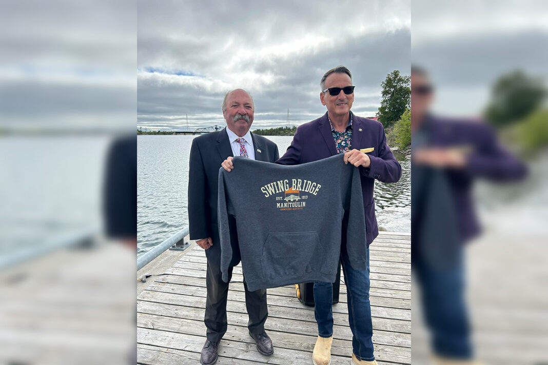 In September of 2023, Minister Rickford, right, attended the Little Current waterfront to announce that the province had given the swing bridge replacement project the green light. He’s seen with Northeast Town mayor Al MacNevin with the swing bridge in the background. Since that day there has been no significant news on the project, despite prods from the media and municipalities. Expositor file photo