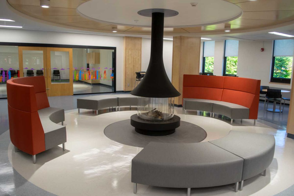 Further back, next to the smudge room, is a coffee-shop-style student lounge. The circular theme carries into this space as well, as it features a propane fireplace in the centre surrounded by soft bench seating.