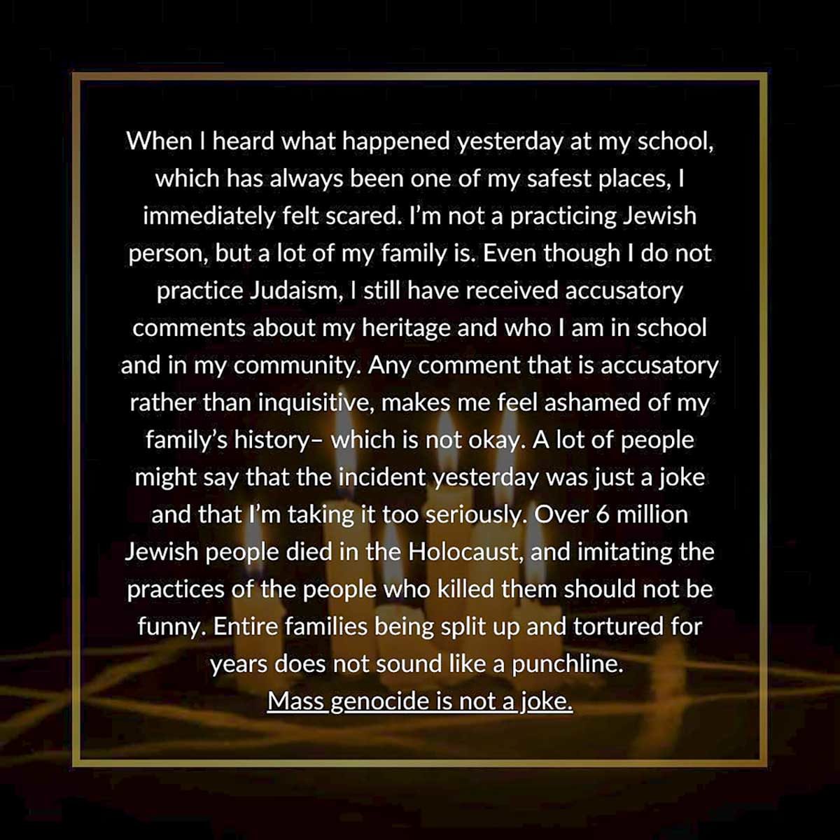 The director of education added that, “After investigating this incident, it became clear that what occurred was not based on hate but based on a lack of understanding of antisemitism and the depth of the atrocities that were committed against Jewish people. Having said that, ignorance is never an excuse. These actions were unacceptable.”