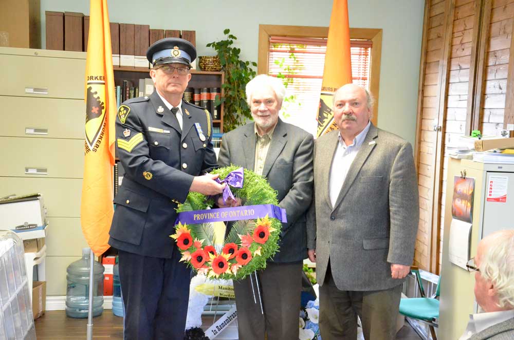 Manitoulin Legal Clinic Executive Director Mike Shain was the first speaker and he recalled one of the most shocking revelations he found while reading the book ‘Working Class War,’ a book on the American involvement in the Vietnam War. “Same number of soldiers died in 1968, the year of highest casualties in the Vietnam conflict,” he said. “There were 100,000 people dying each year from industrial accidents and diseases.” The Vietnam War casualties resulted in massive protest marches and opposition, yet for those lost to workplace tragedy there was, and continues to be, “relative silence.” He was left wondering about the worth placed on workers’ lives—“there have never been nation-wide protests, workers’ names have never been inscribed on a black granite monument. You are left with the impression that workers’ lives don’t matter, they don’t count—if they did matter they would continue to die.”