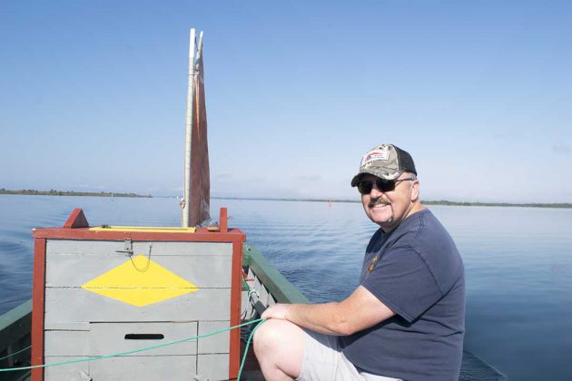 Dean Riggs is at the helm of his unmistakable green and white boat that is probably unlike any other boat that has plied Manitoulin’s waters. It is a 24-foot punt, a type of boat that comes directly from the historic fishing traditions of Canada’s East Coast. This particular vessel is one-of-a-kind, hand-built by Dean’s father Andy in his hometown of Burin, Newfoundland.
