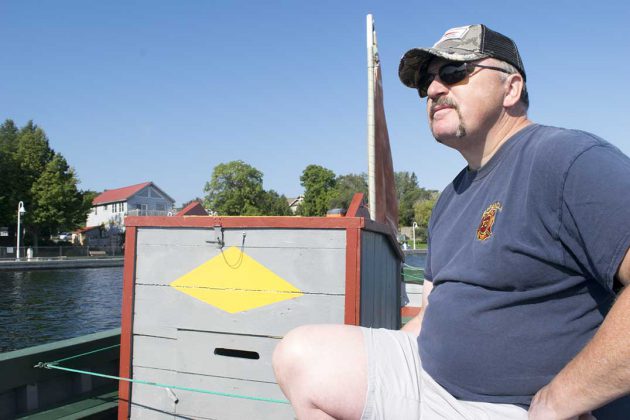 The punt cruises easily past the no wake sign on the approach to Little Current’s downtown waterfront, a sign that can be safely ignored at its stalwart pace. Dean sits in the centre of the boat, controlling the rudder using a pair of ropes strung along the gunwales.