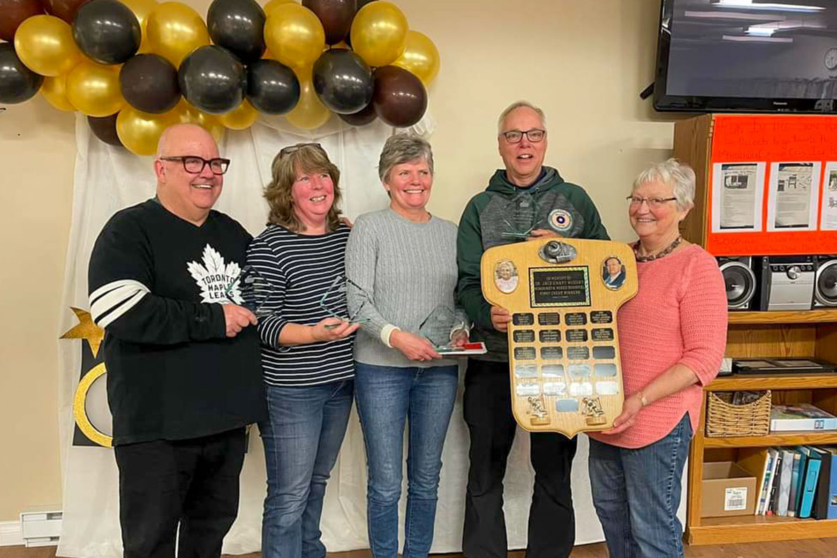 The Mindemoya Curling Club held their annual mixed bonspiel this past weekend. The winners of the first event and the Dr. Jack and Mary McQuay memorial trophies was the rink made up of from left in photo, Greg and Heather Niven, Jeanne and Marc Lefebvre. Jan McQuay presented trophies to the winning team.