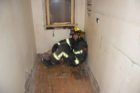 Fire team members then crawled their way through the building on hands and knees just as they would in a fire, feeling their way along looking for victims, identifying doorways, rooms, halls, windows and other structures while sounding the floors ahead of them with their firehose and firefighters’ hooks. An instructor followed the teams as they made their way through the house and ensured they followed proper procedure. A member of the fire department sat huddled in the back of a long closet as the “victim” in need of rescue.