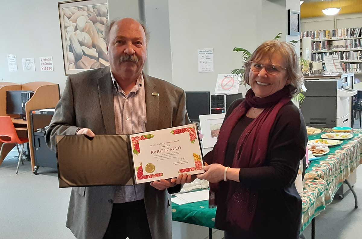 “I can speak for the entire board when I tell you how pleased we have been with Karen’s enthusiasm and success over the last three years,” said library board chair Ned Martin in a statement read by board member Paula Hooper. “Throughout all her time here, Karen has been able to exercise her significant abilities in dealing with people. Her positive attitude and big warm smile make our library a welcoming place for patrons, adults and children alike.”
