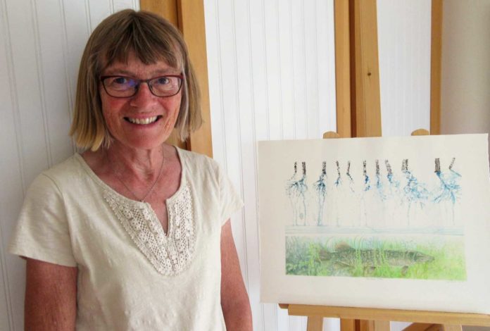 Two Manitoulin Fine Arts Association artists had works selected for this year’s exhibition: Willa Wilson for her monotype and watercolour pencil on arches ‘Northern Pike’ and Linda Williamson for her mixed media image ‘Tree of Life.’