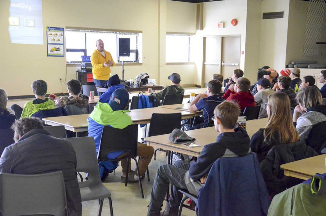 LITTLE CURRENT—Nearly 50 students spent Wednesday, January 3 at the Little Current Recreation Centre with their attention focussed on snowmobiling driving instructor Scott Willis as he took them through the intricacies of safe sledding.