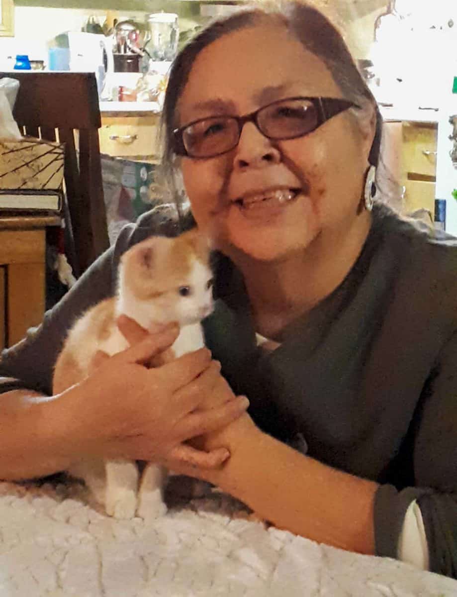 “Favourite pets? We always had a dog and cat growing up. I have two cats now. Their names are Gaazhag (cat), and Gaazhgenhs (little cat). Favourite season? I like them all. Winter is for hibernation, thinking of the bear. Long nights. I think of my own healing with different medicine in the winter, including a cedar sponge bath and an infusion of Labrador tea from time to time. Water on the windowsill during a full moon is healing. Spring is for planting and for dancing at powwows with all the regalia and beadwork displayed. Summer is for harvesting, vegetables and sweetgrass. Fall is also for harvesting and preparing for winter.”