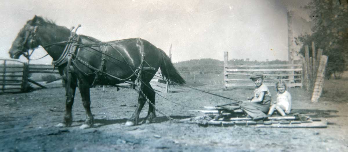 Jack Wood’s younger siblings, brother Ronnie and sister Marion, riding on the stone boat pulled by the family horse on the way to school.