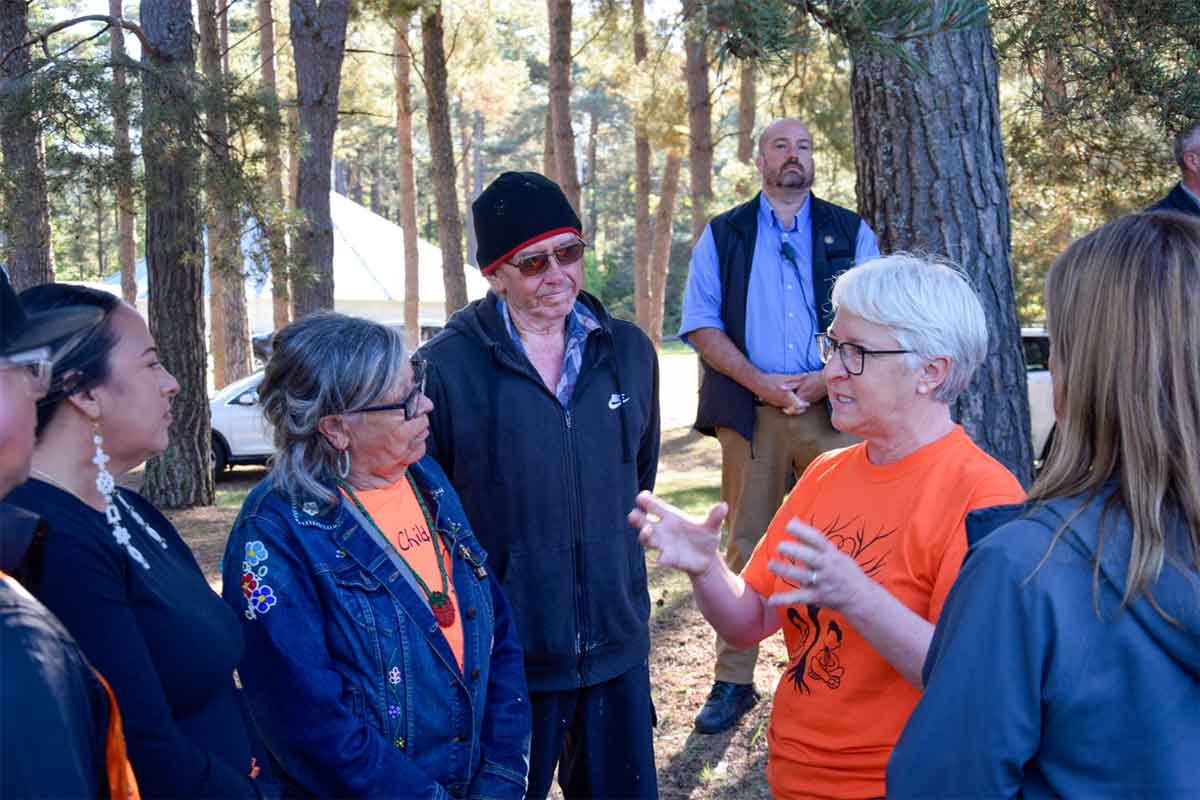 “Chiefs, veterans, dancers, singers, the welcoming party on the cave—thank you for the warm welcoming since we arrived earlier this morning,” said Lt. Gov. Dumont. “I’m a francophone from east of Ontario. So, I’ll be using a little bit of French here and there, so I feel grounded. This is something I learned while visiting First Nation communities, how important it is to preserve our mother tongue. I met recently a teacher, a member of Anishinaabe community, a PhD doctor in Indigenous languages working for Ontario to make sure that indigenous languages are preserved. It’s a member of your community, a doctor at York University.”