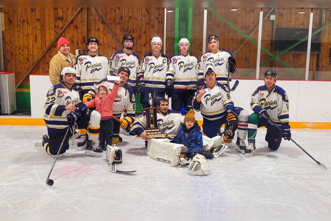 Patriots Sportsmen (White jerseys w gold and blue and kid wearing pink jacket) were the A division winners of the Tom Pearson Memorial Trophy. Front Row, from left, are Greg Trudeau-Paquet, Jordan Trudeau, Evan Peltier, Jenmee Bondy and Jonas Aiabens. Back row: Coach:Tony Manitowabi, Ian Dokum, Tanner Webkamigad, Lukas Abotossaway, Eric Charlabios and CJ Newbury.