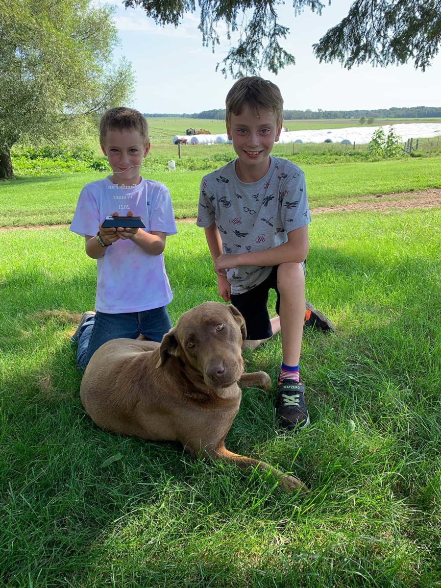 Shawn & Devon MacKelvie accepting the award for the Larry Norand Family winners of the Family Fun Trophy. The rest of the family is haying in the back ground.