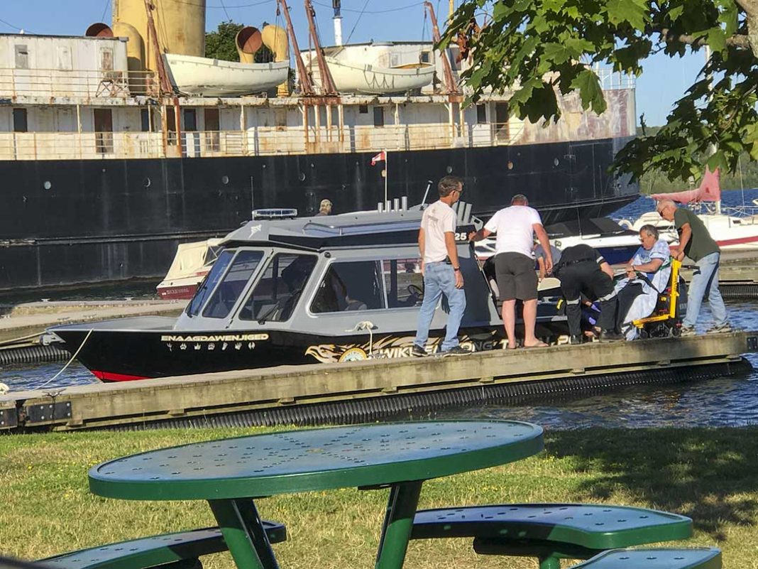 A significant crowd had gathered by the shore by the time a Wikwemikong Tribal Police Service boat was backed out into the water at the Manitowaning marina to set out on a rescue mission, assisted by members of the Assiginack Fire Department and the OPP. Wikwemikong Tribal Police Service Sergeant Cooper and Constable Di Salvo operated the rescue boat.