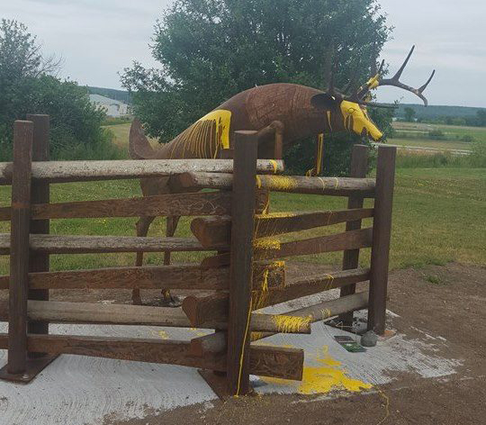 MANITOWANING – On Friday July 17, 2015 at around 8:30 am a town employee of the Assiginack Township reported to the Manitoulin Detachment of the Ontario Provincial Police (OPP) that sometime overnight, vandalism was done at the Deer Statue adjacent to Highway 6 at the Tourist Information Booth in Manitowaning, Ontario. Police attended and noticed that bright yellow paint had been poured over the metal statue and surrounding area. Police have initiated an investigation into this mischief of property.