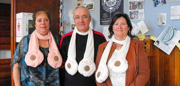 There are a few Islanders, not to mention local MPs and MPPs too, who are donning ‘boob scarves’ these days. Yep. Boob scarves. And they look exactly like they sound. Coming in shades of pink or white, instead of the typical fringe at the end of the scarf one will find a breast with a nipple, encircled with embroidery that reads ‘support breast cancer research’ and a pink breast cancer ribbon too.