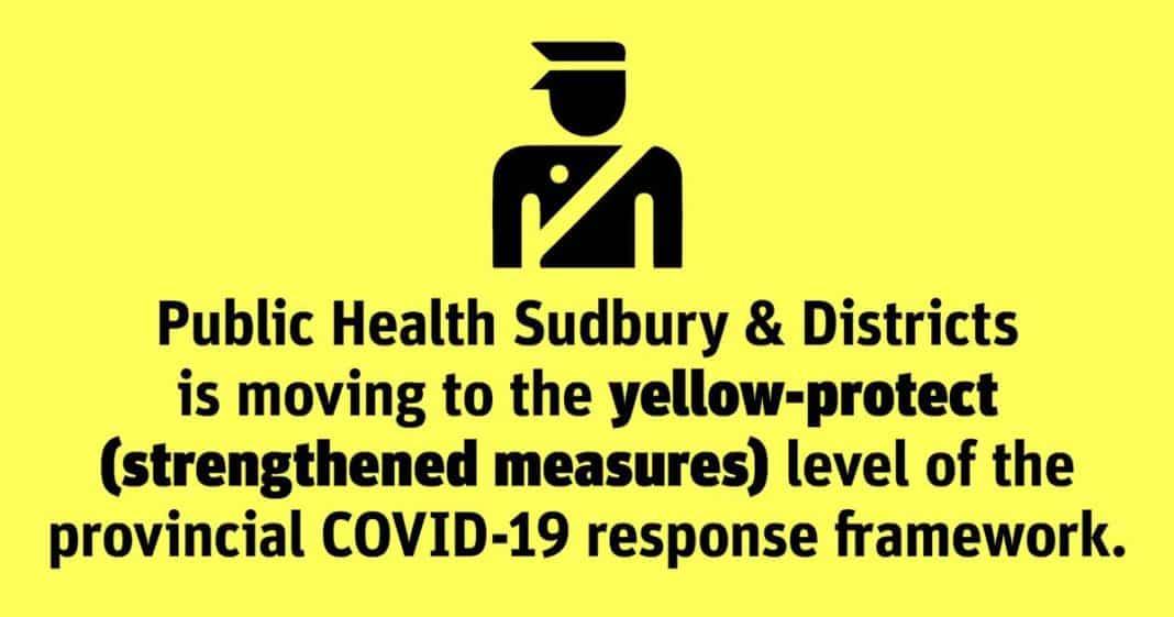 Today, the Government of Ontario placed Public Health Sudbury & Districts in the “Yellow-Protect” category of the provincial COVID-19 response framework. Strengthened public health measures will come into effect in our service area to help control the spread of COVID-19 on Monday, November 16, 2020, at 12:01 a.m. These measures include limited hours of operations for certain settings, reduced recreational program sizes, additional enforcements and fines, and enhanced education in high-risk settings.