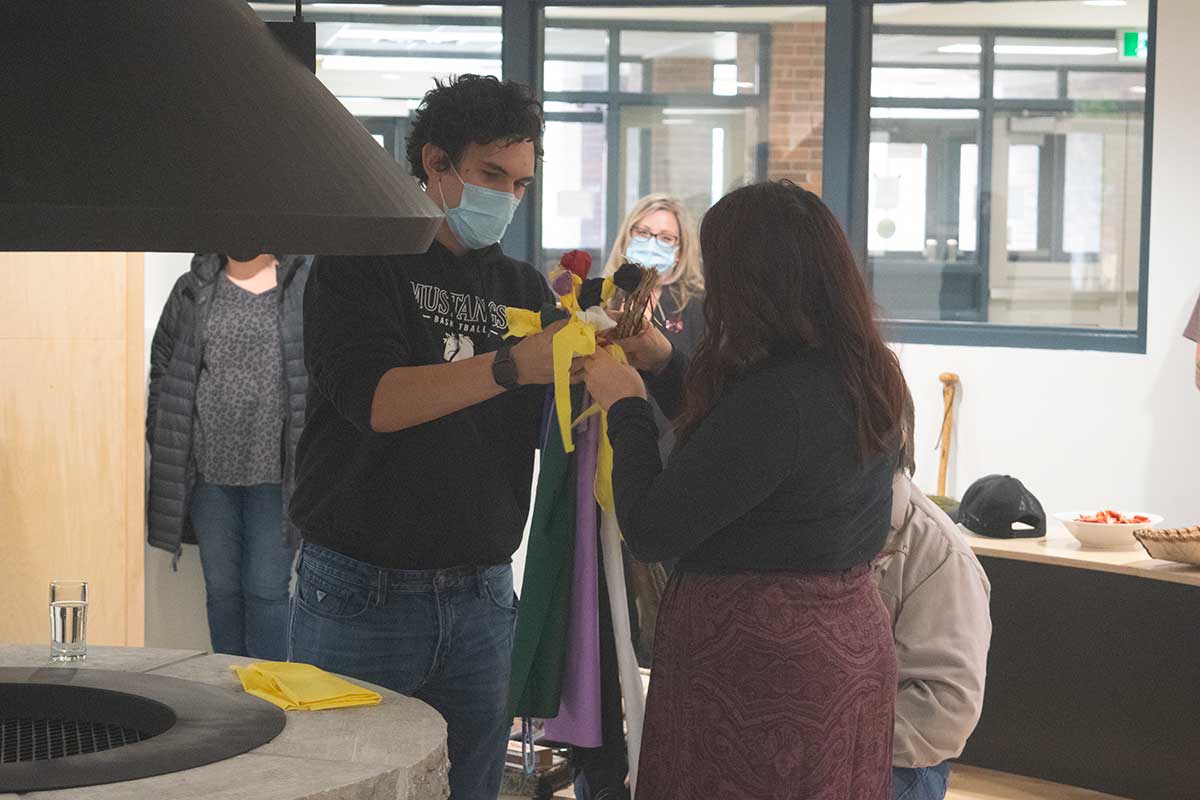Mr. Mohamed then invited a smaller number of guests to reconvene inside in the new sacred fire and smudge room, where Mr. Eshkawkogan furthered his teachings about change and the seven sacred directions. Another smudge took place as seven students created medicine bundles, which were then brought together as a single unit tied with sweetgrass braids.