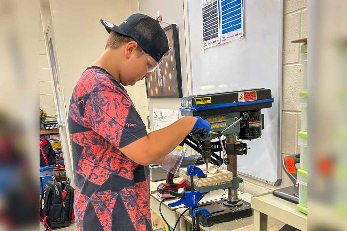 Bryson Corbett of Assiginack Public School works on a drill press to make holes for the handle of his toolbox.