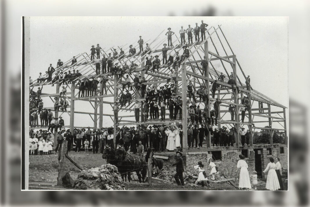 When the sides were assembled, the teams were hooked to them, and the men then lifted the upper end from the ground and raised it as high as they could reach. The framing was going over a stable, so the bottom of the frame was already on the edge of the concrete foundation. After the upper plate was lifted as high as possible, the pike poles were used until they reached as high as they could. The horse then pulled the sides upright, where they were held in place by ropes. Both sides had to go up before the ends.