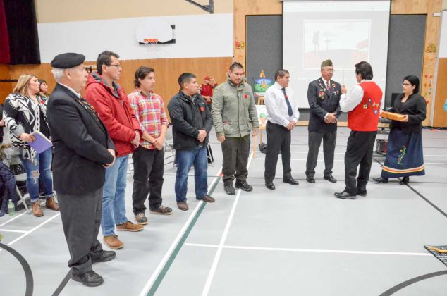 Wiikwemkoong veterans are presented with eagle feathers by Wiikwemkoong Ogimaa Duke Peltier in a sombre ceremony conducted during Remembrance Day ceremonies held at Wiikwemkoong High School last Friday.