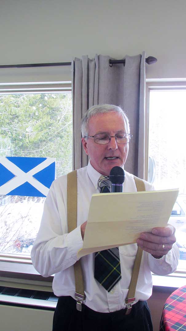 At the arrival of everyone in the main room, Peter Gordon read in Scottish dialect, “The Address to the Haggis.” The haggis is a traditional Scottish dish memorialized as the national dish of Scotland by Robert Burns poem in 1787.
