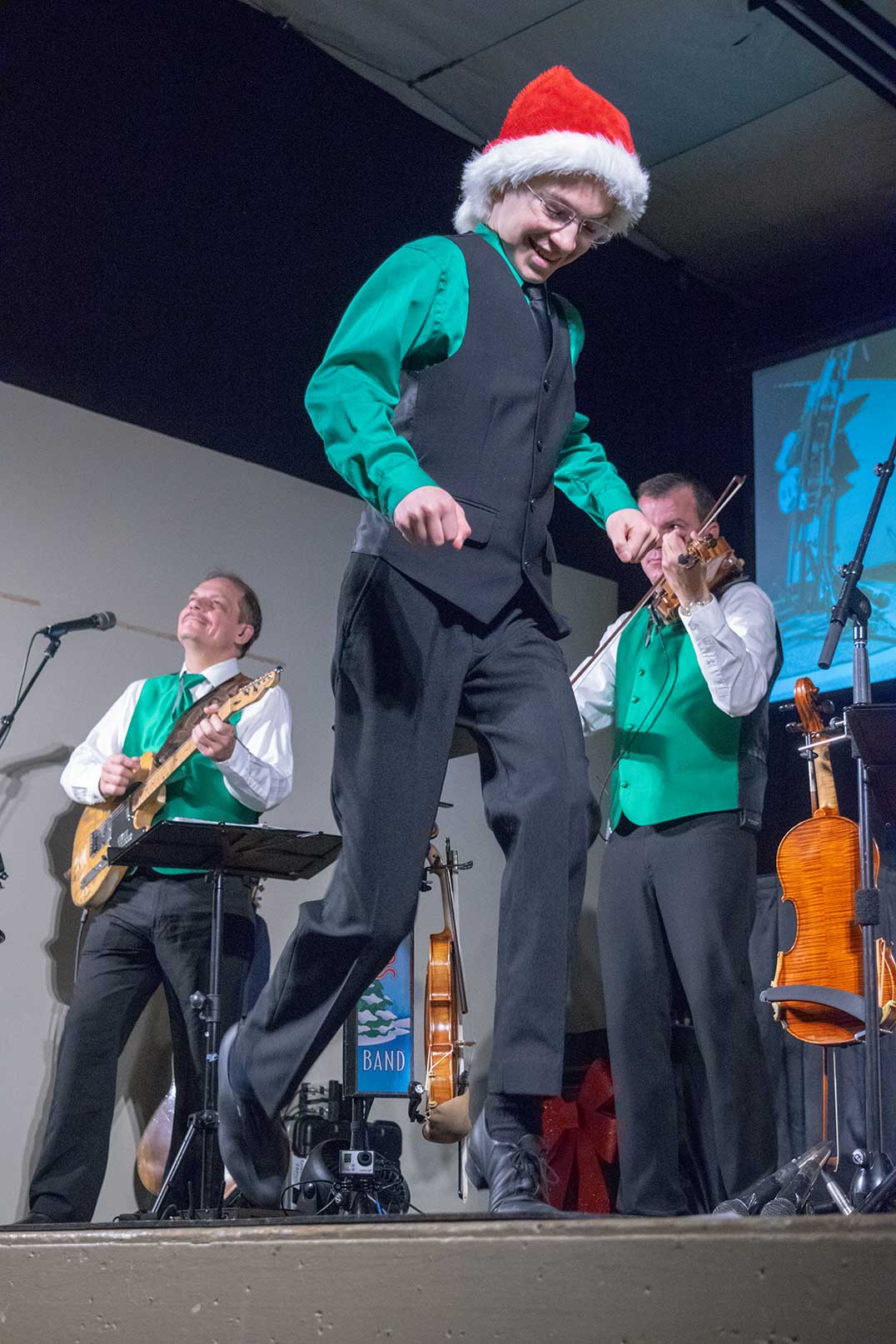 A unique element to this performance was three cameras, one mounted near Leo’s step dancing area, one on Mr. Woods’ music stand and the third on Mr. Piticco’s stand. A projector screen above the band offered everyone in the audience a close up look of their masterful talents.
