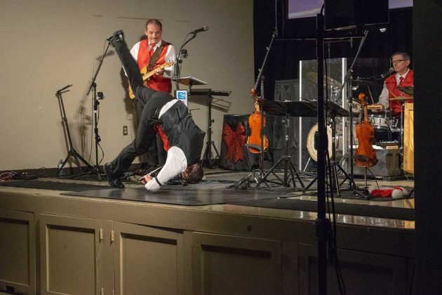 Next was a band original song called ‘Finger Twister.’ Leo jumped in near the end with an entertaining slide whistle accent before disappearing backstage. Where he had gone was soon evident as the band began into ‘Mele Kalikimaka,’ the Hawaiian Christmas song. Part-way through, the band’s own hula dancer—Leo—re-emerged wearing flowing black hair and a grass skirt and traversed the front of the stage. He even kept the getup on as he step danced during the next upbeat fiddle feature, ‘Alabama Jubilee.’