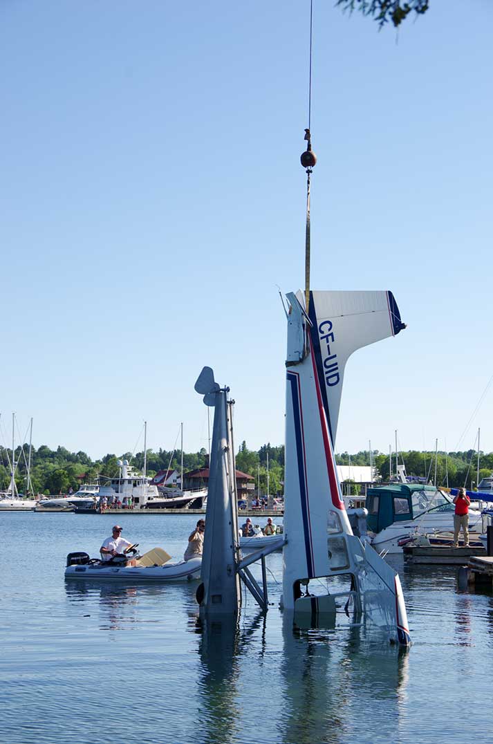 After determining there were no injuries, Transport Canada was able to release the scene within an hour. But it was another four hours until the plane was completely removed from the lake and back on dry ground. Ron Campbell of Dad’s Sales and Service used his crane to hoist the Cessna 185 Skywagon, letting it drain before righting it.