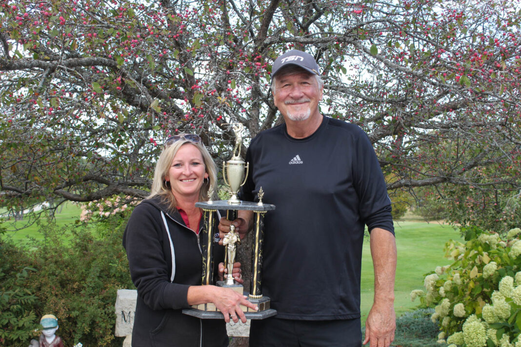 In photo, left, Cheryl Deeg, manager of the Manitoulin Golf clubhouse presents the men’s match play championship trophy to Mr. MacQueen.