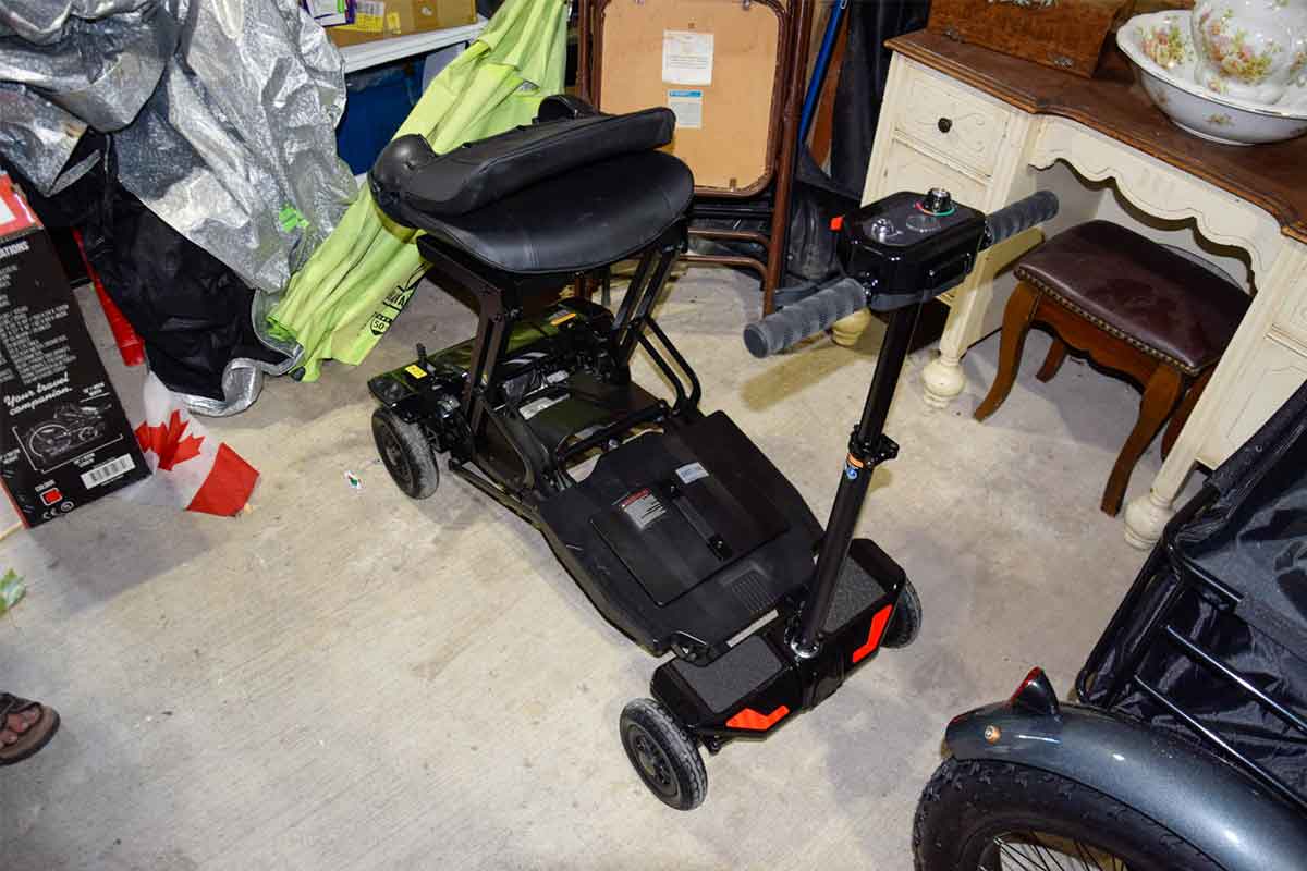 Mr. Abotossaway’s product mix is amazing, with something for just about anybody. He demonstrates a collapsible scooter that folds up to a very compact package. “The unit weighs about 70 pounds,” he said. The range on that unit is only about 15 kilometres, but that’s enough to bomb around town. The pace is sedate, only around nine kilometres per hour, but that is faster than walking.