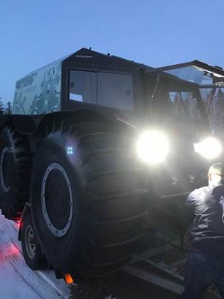 very short time later and unloaded the vehicle. Felix, accompanied by one of our Officers, drove the “Sherp” through the treacherous terrain, safely breaking through the ice and driving through the deep water.