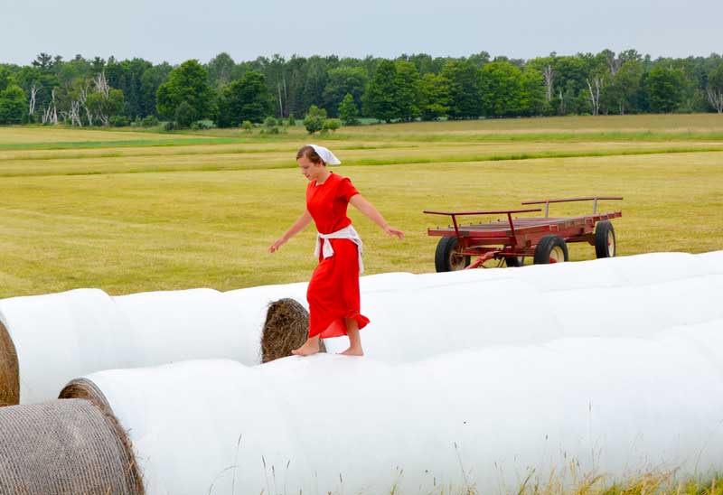 We came across a car parked by the side of the road with three people walking along the side of the road and a barefoot young lady walking in the adjoining pasture on the top of fresh hay bales wrapped in white plastic. She was skipping graciously in an angelic manner, something we had never before seen on our Manitoulin adventures! However, what first captured our attention was the colour of her dress—it was bright rose-red.