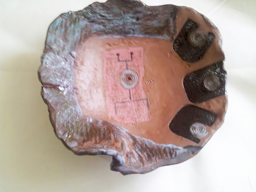 The symbols Mr. Garcia used in decorating his artwork was inspired by his visit to the caves of Aruba and the petroglyphs found therein.