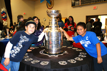 Birch Island kids Anthony McGregor, left, and his cousin, Wesley McGregor, had their photo taken with the Stanley Cup on October 26. The cup was at the Birch Island Community Centre, along with the Vezina and Calder trophies, during a fun-filled day of activities planned by band council.
