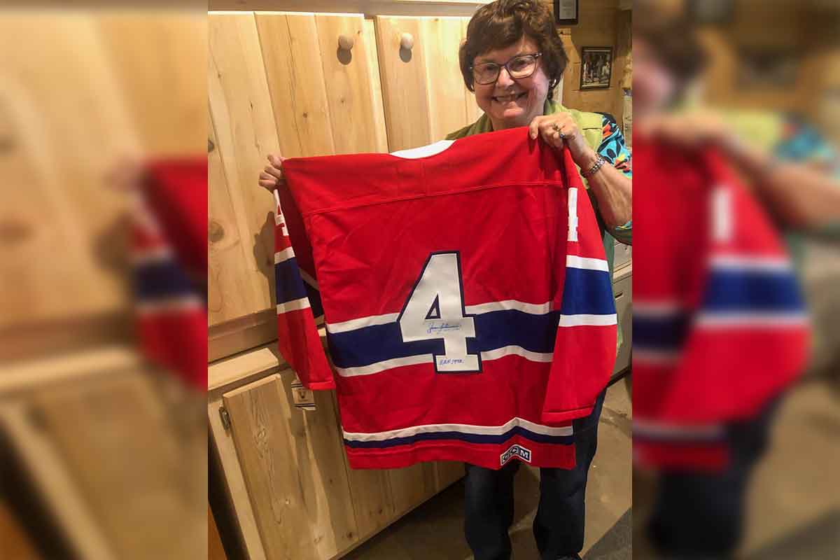 Dianne Fraser, a member of the Old Mill Heritage Centre museum committee, displays an autographed Montreal Canadiens Jean Beliveau number four jersey that will be on display at the museum as part of its hockey display in 2026.