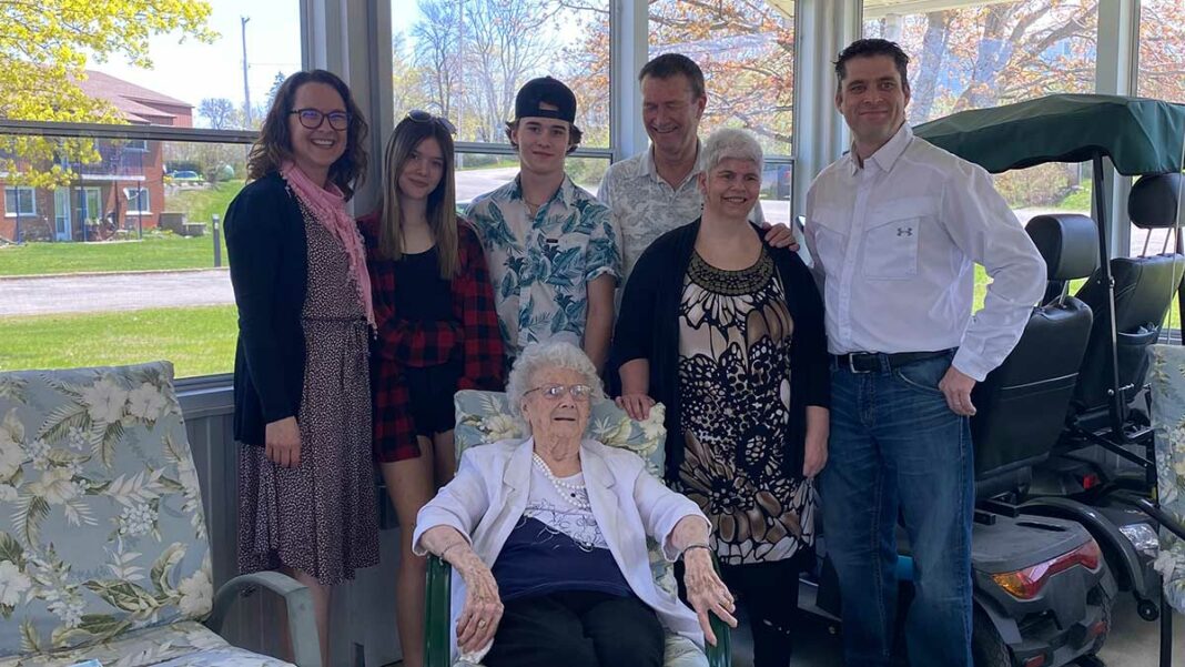 Edith Best, a resident of Manitoulin Centennial Manor, proved to be a lively and engaging individual when The Expositor caught up to her 100th birthday celebrations held in the gazebo at the Little Current long-term care facility. Ms. Best noted that she could still outpace any of the residents, to the unending amazement of the older gentleman in the home. Ms. Best vehemently denied being a centenarian, maintaining that age is simply a figment of the imagination. Ms. Best is seen here with her children and grandchildren. Robyn Best (granddaughter-in-law), Brynn Best (great granddaughter), Corbin Best (great grandson), son Brad Best, Cara Best (granddaughter) and Clayton Best (grandson).