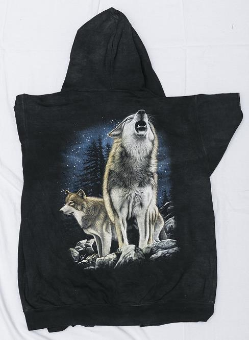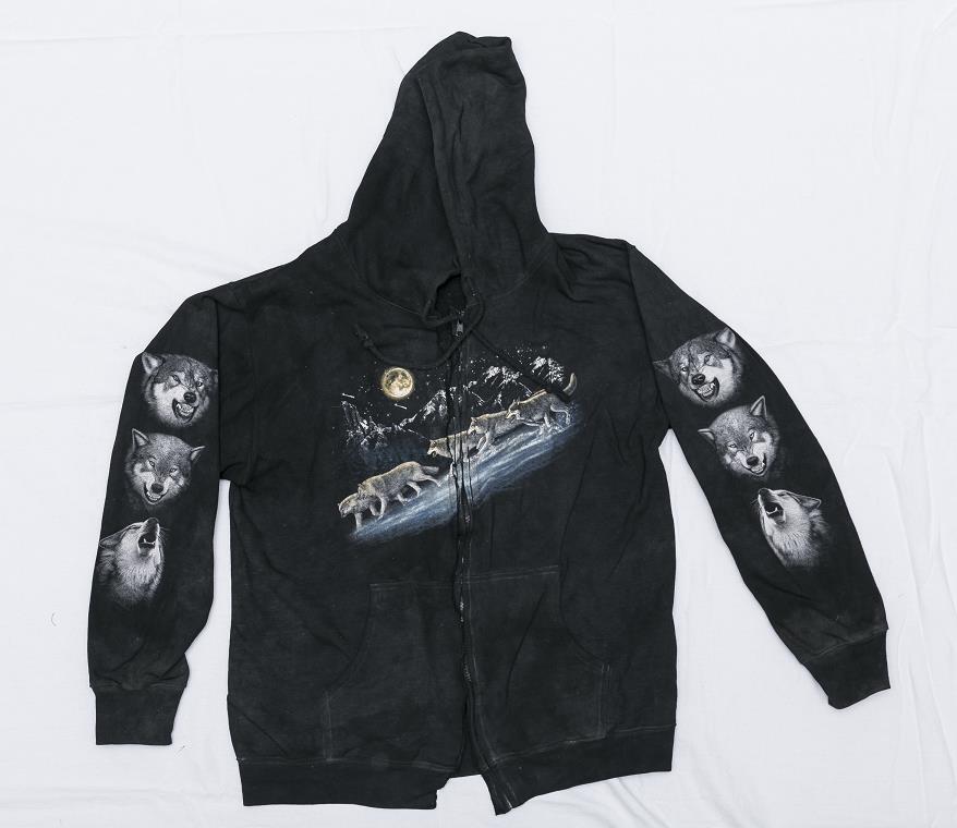 • Found wearing a unique dark hoody with images of wolves on chest, sleeves, and back