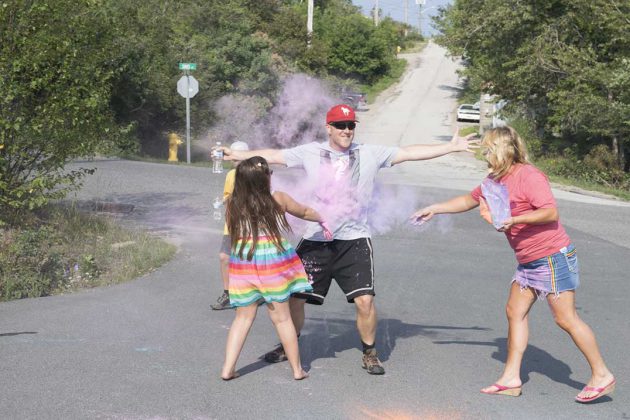 Pride Manitoulin organizer and founder Sarah Seabrook enlisted the help of her children to support the event—as the fun run started, son Noah Thorpe kept pace with the lead runner on his bicycle to show the way. Ms. Seabrook’s daughter Darcy Thorpe enthusiastically dusted the tired runners—and herself—with Holi powder at the finish line.