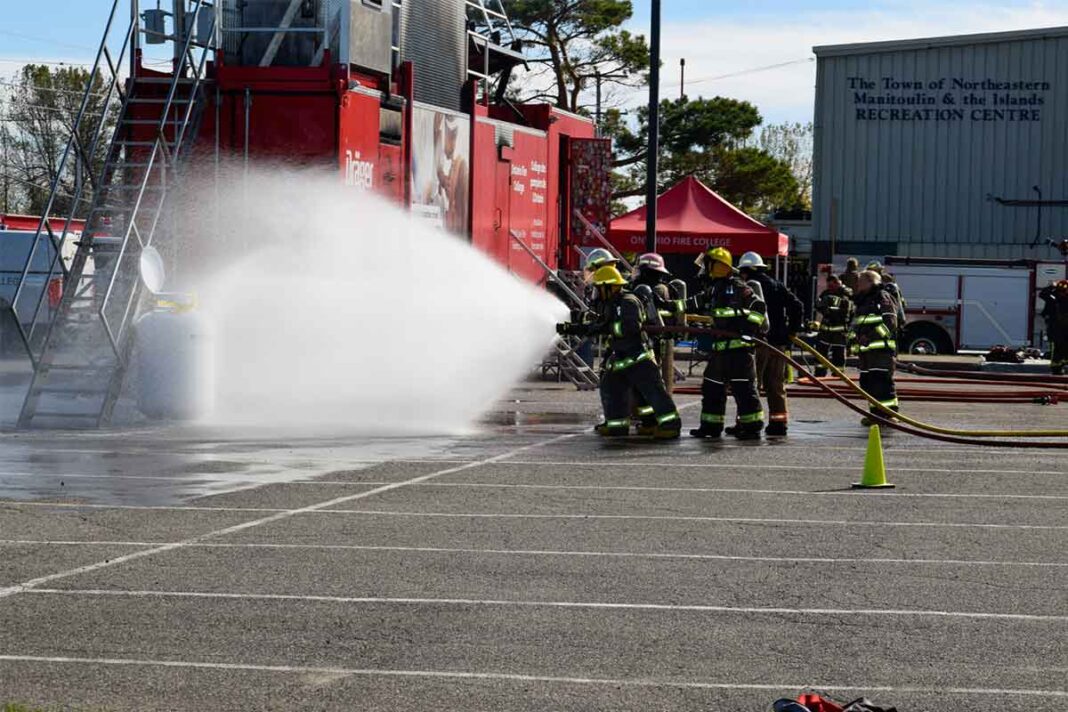 TEAMWORK IS THE KEY! Members of the Island’s volunteer firefighting departments train in the Northeastern Manitoulin and the Islands Recreation Centre parking lot. The portable training facility allowed firefighters to gain vital certifications as well as learning key safety techniques. The team pictured above were training to battle propane tank fires.